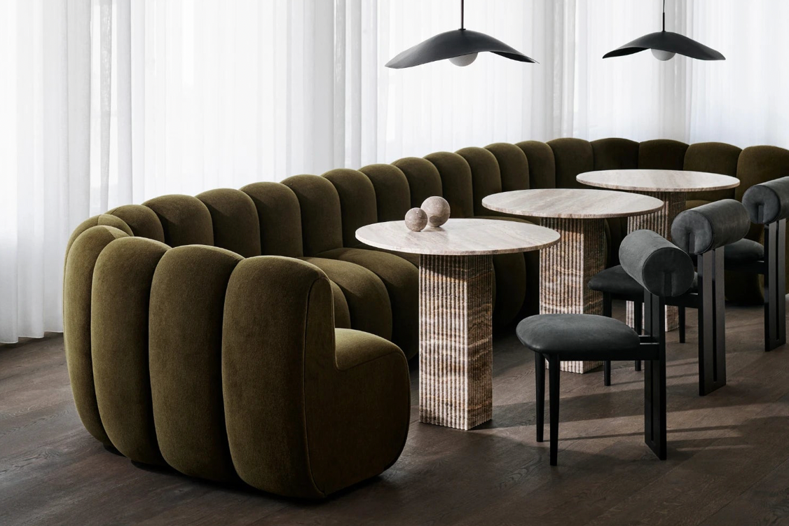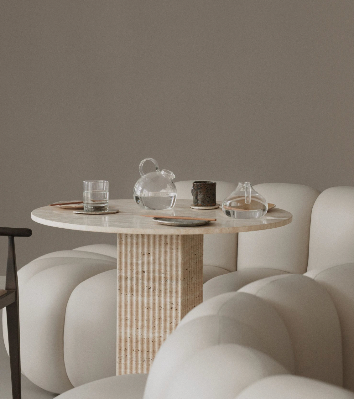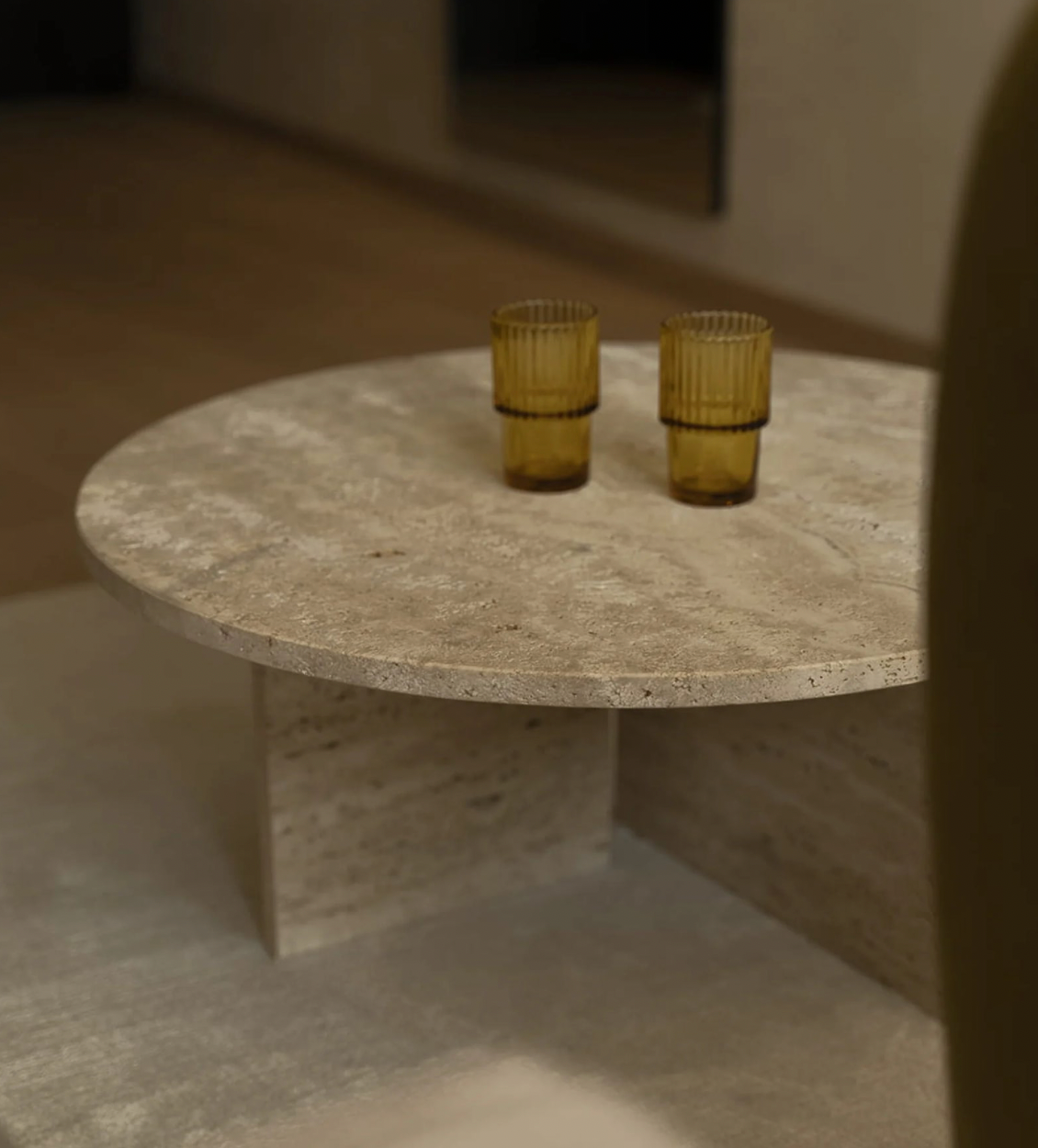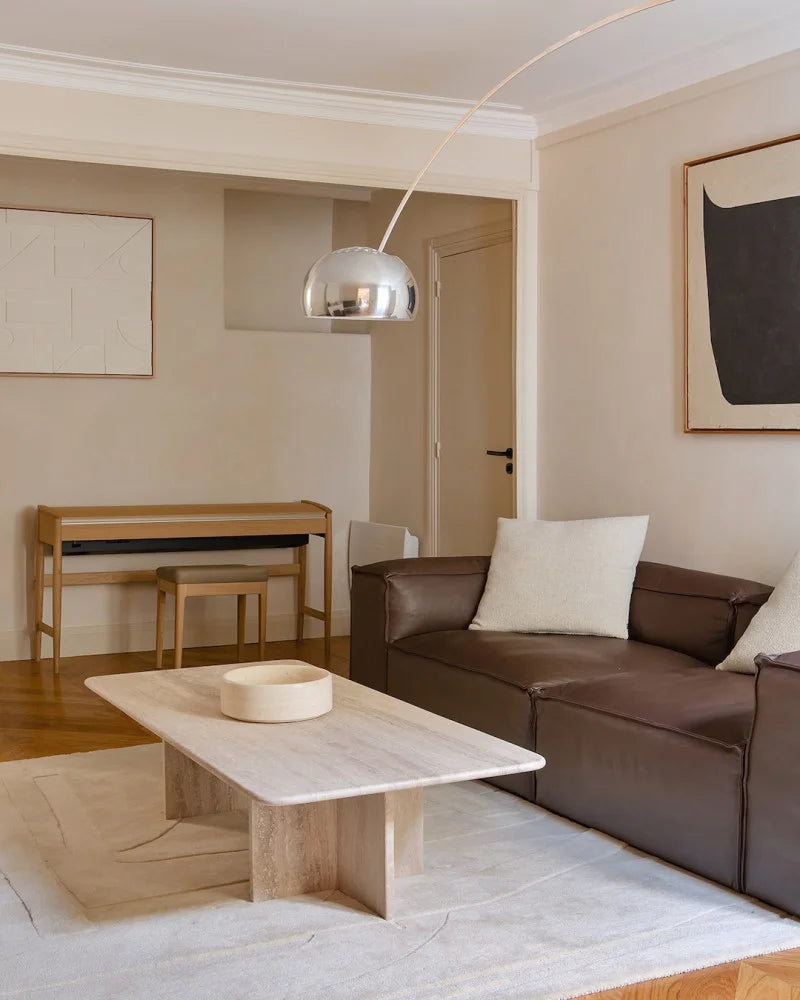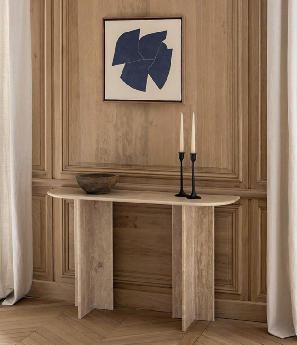 Chez BLUE, nous réalisons des pièces de mobilier en travertin, marbre, bois, verre et tissus, avec l'un des niveaux de finition les plus exigeants au Maroc.